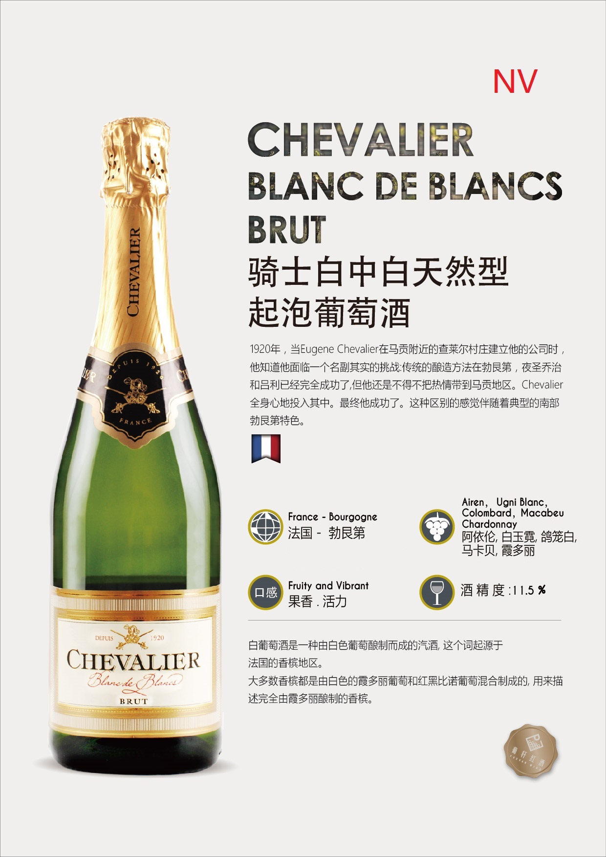 葡萄品种 | Airen 阿依伦 Ugni Blanc 白玉霓 Colombard 鸽笼白 Macabeu 马卡贝 Chardonnay 霞多丽 | 酒精度 | 11.5%vol | 酒体 | 轻盈 |