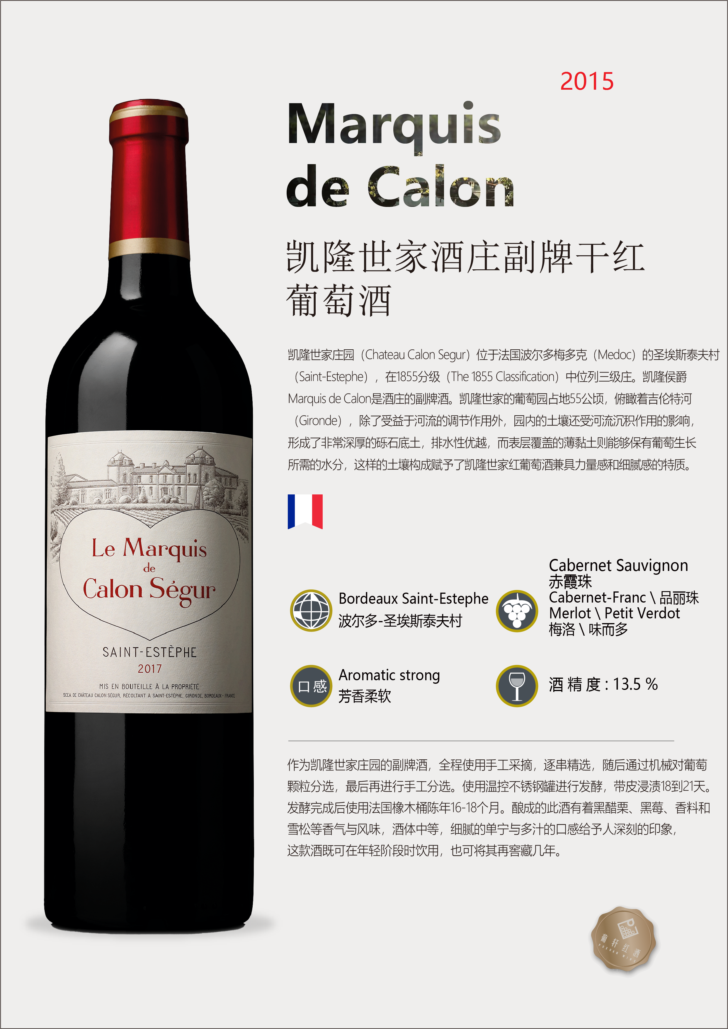 卖点 | 1855分级(The 1855 Classification)中位列三级庄。凯隆侯爵Marquis de Calon是酒庄的副牌酒 | 级别 | AOC | 酸度 | 中等 |