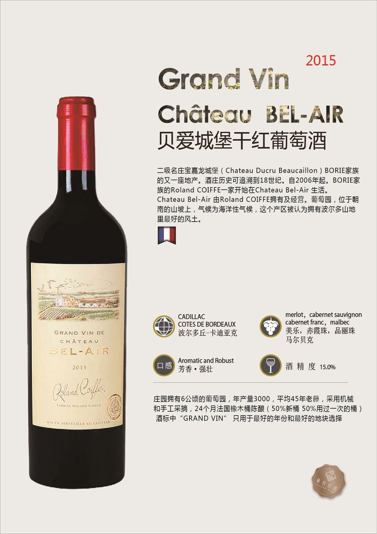 橡木桶陈酿时间 | 24个月陈酿100%法国橡木桶 | 葡萄采摘年份 | 2015年 | 产品类型 | 干红葡萄酒 |