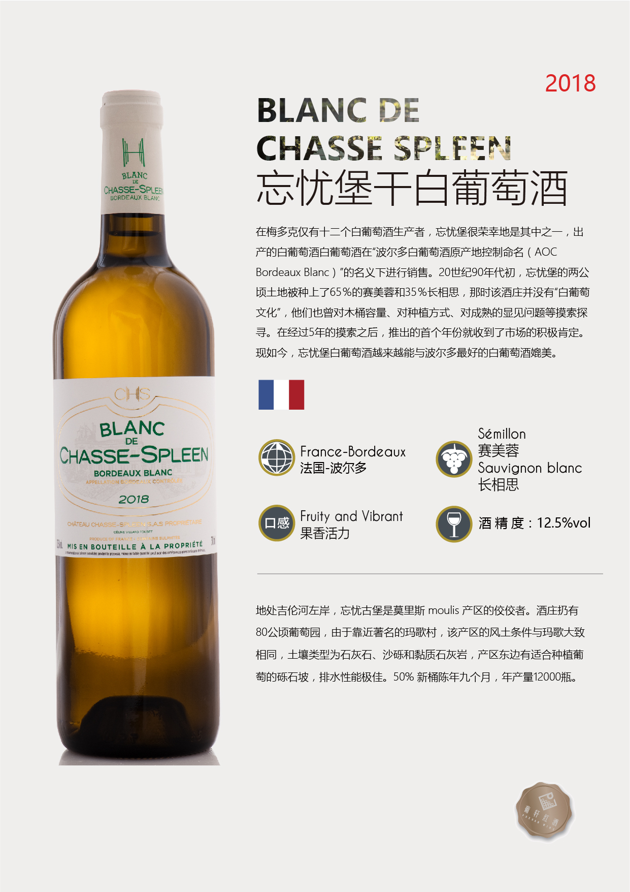 品饮记录 | 白葡萄酒在梅多克很少见!淡黄色,白色桃鼻,带有淡淡的黄杨木味。在口感上,入口直率,赛美蓉为葡萄丰盈的为酒带来了很好的柔顺感。余味持久,带有橙花和柑橘的气息。Blanc de Chasse Spleen 是一款非常漂亮的白葡萄酒,带有木香。 | ||||