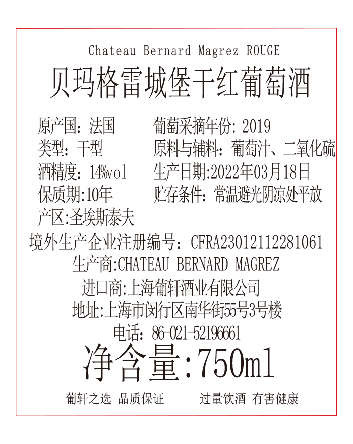 酒体颜色 | 石榴石红色 | 包装规格 | 6/木箱 | 口感 | 芳香强壮 |