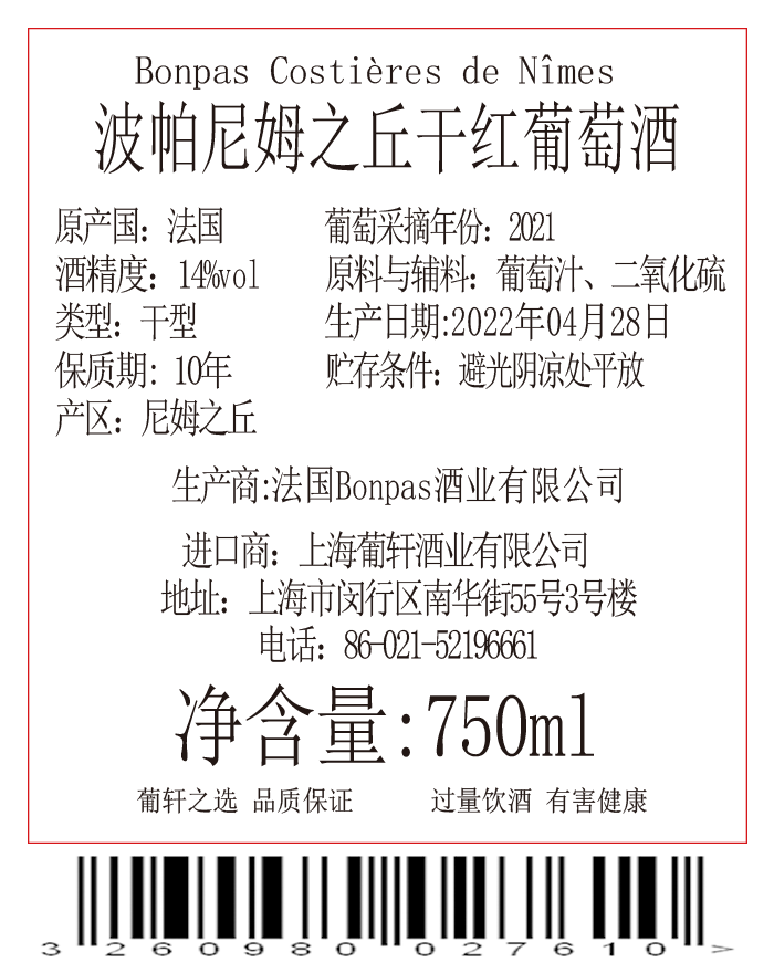 酒体颜色 | 石榴红 | 包装规格 | 6支/纸箱 | 口感 | 果香 |
