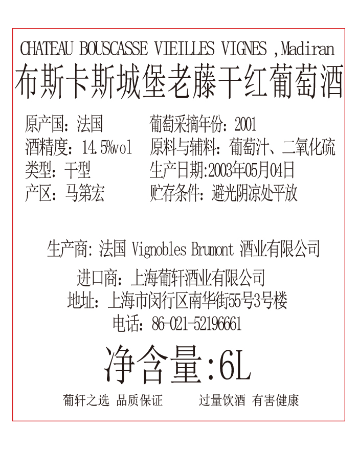 橡木桶陈酿时间 | 24个月 | 葡萄采摘年份 | 2001/2000 | 产品类型 | 干红葡萄酒 |